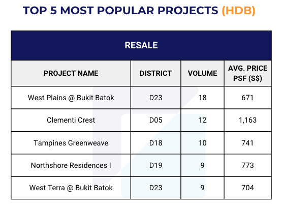 The most popular HDB projects with highest transaction volume in August are: West Plains @ Bukit Batok, Clementi Crest, Tampines Greenweave, Northshore Residences I & West Terra @ Bukit Batok.
