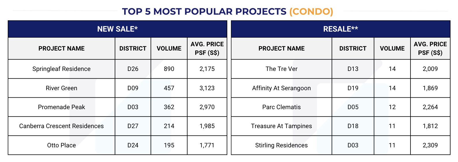 For Condo new sales, the most popular projects with highest transaction volumes in August are: Springleaf Residence, River Green, Promenade Peak, Canberra Crescent Residences & Otto Place.