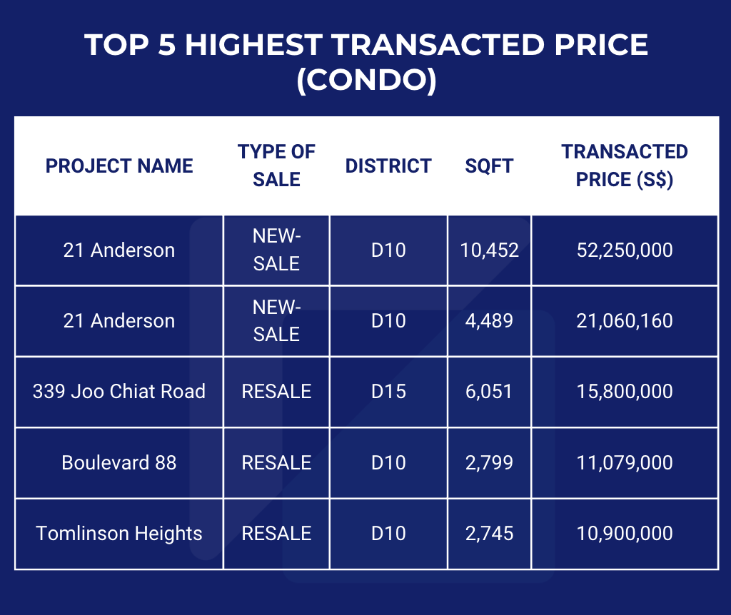 The most expensive Condo transaction in August 2025 is another 5-bedroom new unit at 21 Anderson, which was sold at a gargantuan $52.25 million for a total area of 10,452 sqft ($4,999 PSF).