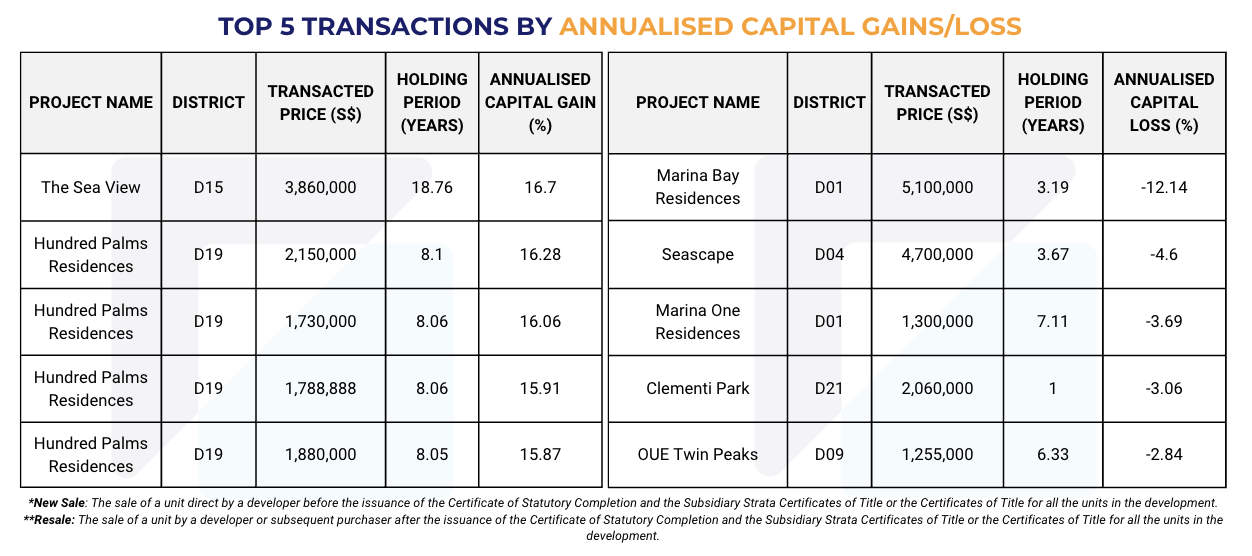 The highest annual loss percentage of the month was seen in a unit at Marina Bay Residence in D01 after a holding period of 3.19 years, which recorded an annual loss of 12.14%.