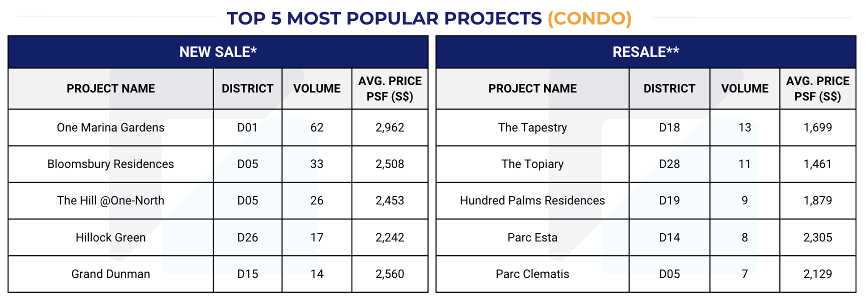 For Condo new sale, the most popular projects with highest transaction volume in April are: One Marina Gardens, Bloomsbury Residences, The Hill @ One North, Hillock Green and Grand Dunman.