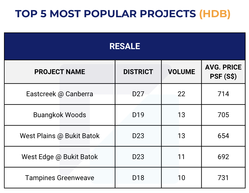 The most popular HDB projects with highest transaction volume in April are: Eastcreek @ Canberra, Buangkok Woods, West Plains @ Bukit Batok, West Edge @ Bukit Batok and Tampines Greenweave.
