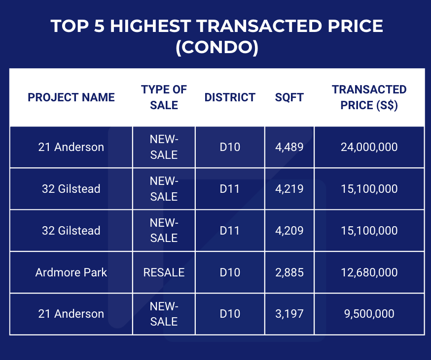 The most expensive Condo transaction in May 2025 is a 4-bedroom new unit at 21 Anderson, which was sold at $24 million for a total area of 4,489 sqft ($5,347 PSF).