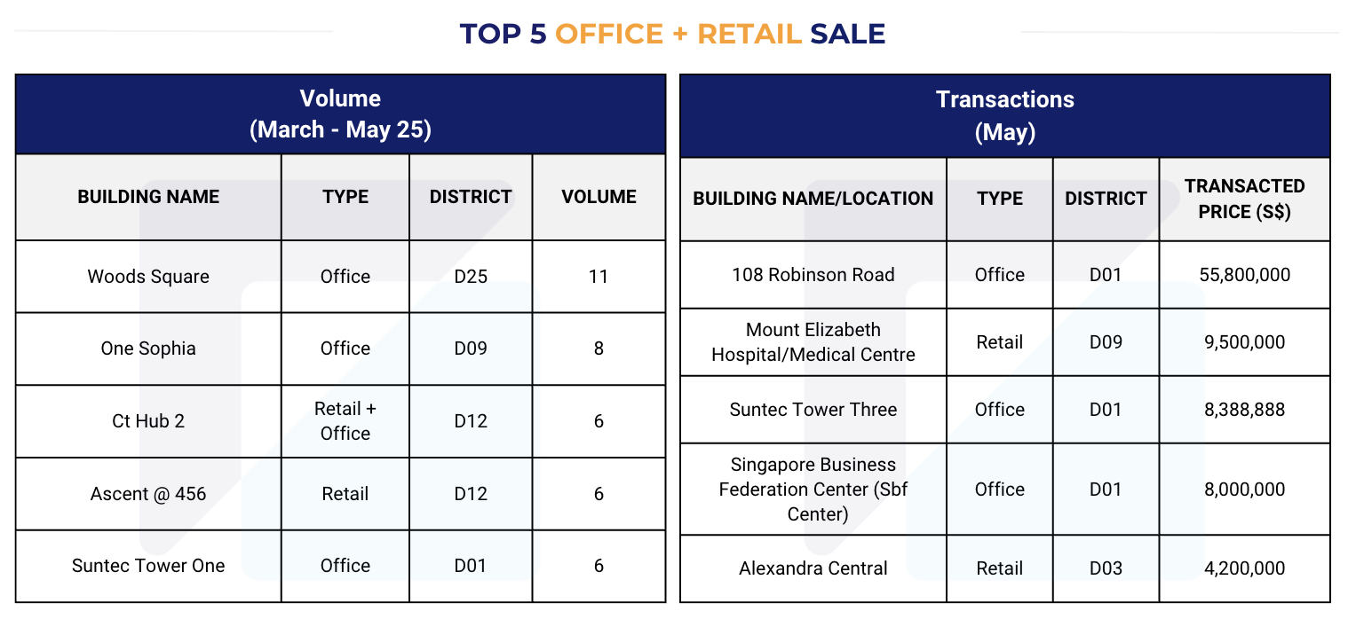 1. Top 5 Office and Retail Sale (by volume and transacted price) (March 2025 - May 2025)