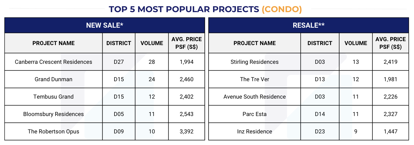 For Condo new sales, the most popular projects with highest transaction volumes in September are: Canberra Crescent Residences, Grand Dunman, Tembusu Grand, Bloomsbury Residences & The Robertson Opus.