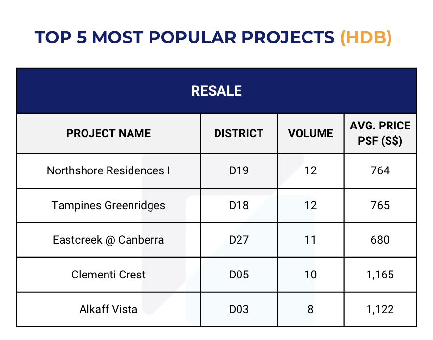 The most popular HDB projects with highest transaction volume in September are: Northshore Residences I, Tampines Greenridges, Eastcreek @ Canberra, Clementi Crest & Alkaff Vista.