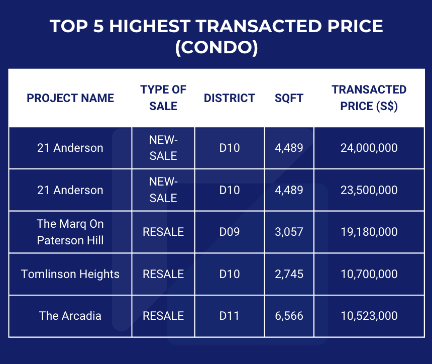 The most expensive Condo transaction in September 2025 is another unit at 21 Anderson, this time a 5-bedroom new unit which was sold at $24 million for a total area of 4,489 sqft ($5,347 PSF).